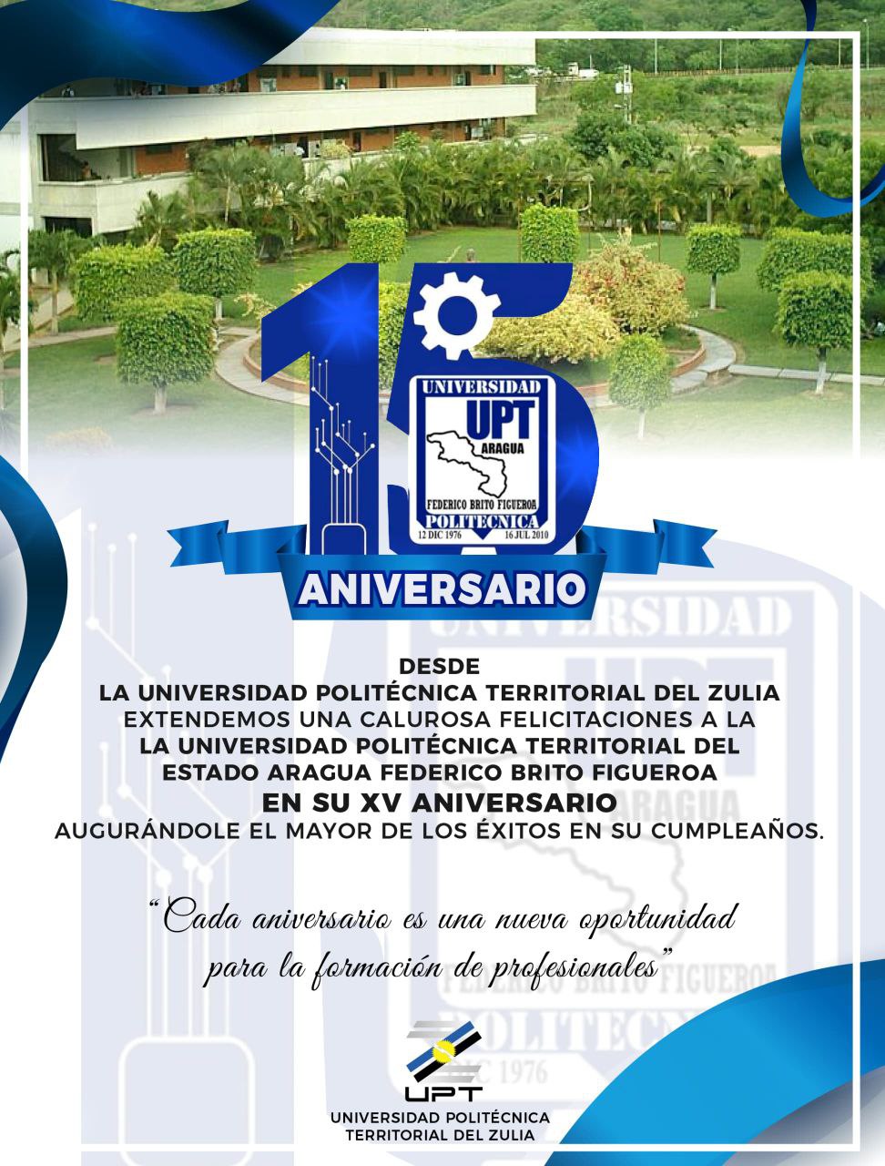 La UPT-ZULIA y su Rector, Dr. Pedro Alberto Isea González, felicitan en su XV Aniversario a la UPT – Aragua «Federico Brito Figueroa».