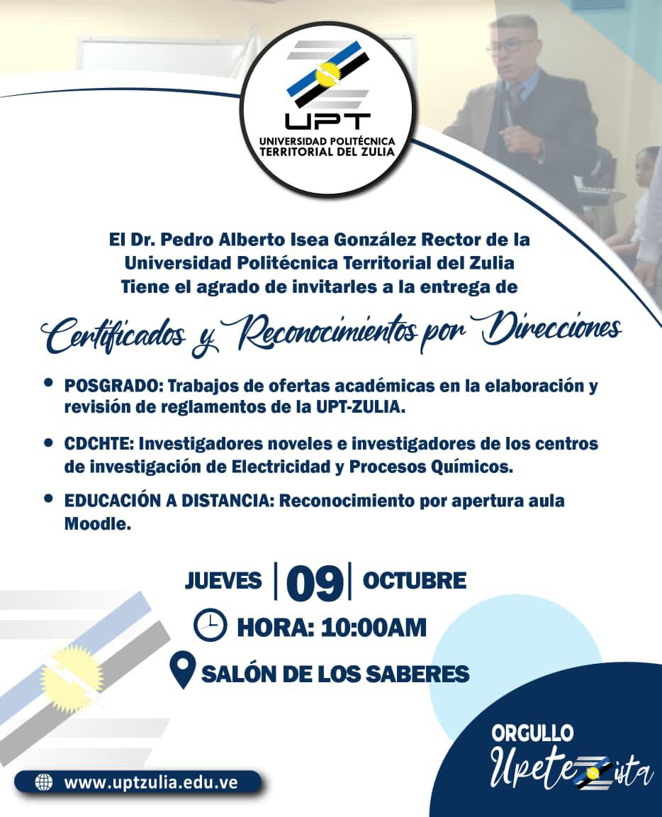 La UPT-ZULIA y se Rector, Dr. Pedro Alberto Isea González, invitan a la comunidad universitaria al Acto de Entrega de Certificados y Reconocimientos a Direcciones de la institución por su desempeño, a efectuarse el próximo jueves 09 de octubre en el Salón de los Saberes, a partir de las 10:00 am.