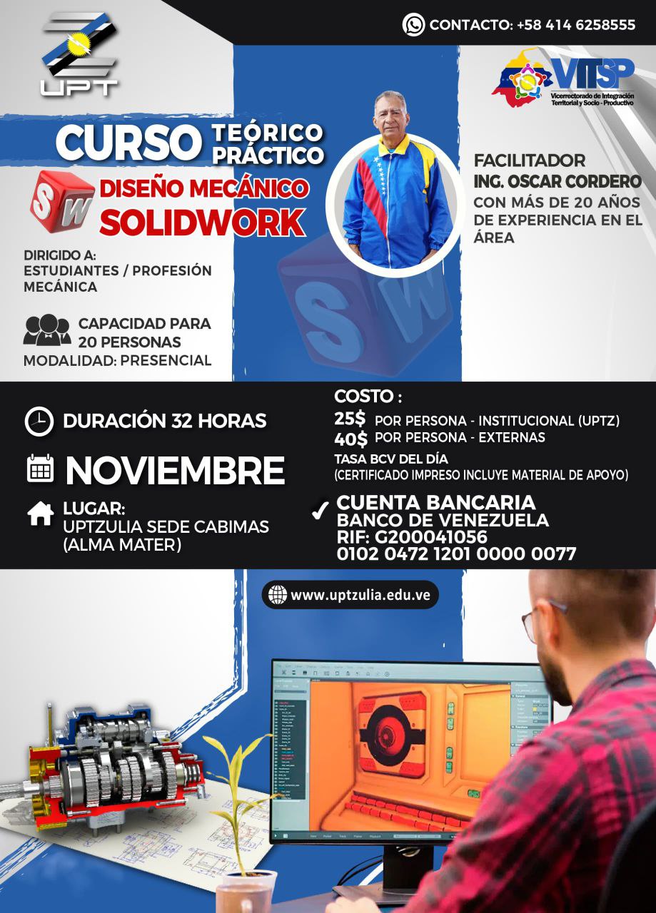 Cumpliendo instrucciones del Rector, Dr. Pedro Alberto Isea González, el Vicerrectorado de Integración Territorial y Socio-Productiva, informa que ya están abiertas las inscripciones para el Curso Teórico – Práctico de Diseño Mecánico de Solidwork, dirigido a estudiantes y profesionales en Mecánica.