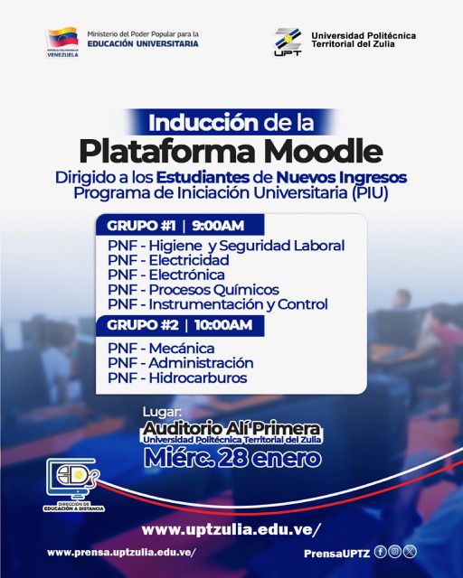 Con el objetivo de garantizar una transición efectiva hacia las herramientas de aprendizaje digital, la Universidad Politécnica Territorial del Zulia (UPTZ) llevará a cabo una jornada de inducción sobre el manejo de la plataforma Moodle. Esta actividad está dirigida exclusivamente a los estudiantes de nuevo ingreso que forman parte del Programa de Iniciación Universitaria (PIU).
